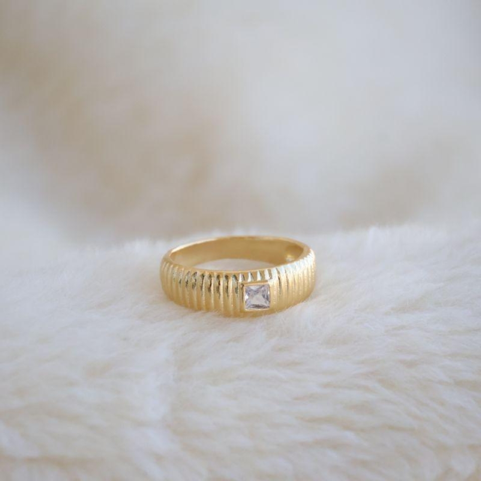 Banhado a ouro, frisos elegantes contornam todo o anel, enquanto a zircônia central ilumina com sofisticação. Um design moderno, luxuoso e cheio de personalidade.